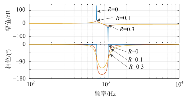根據表3參數繪制的W2(s)W2(s)的Bode圖(圖5),可見即使PWM單元是理想的受控電流源,iSiS依然會在ωn=1/(L+LS)C−−−−−−−−−−−√ωn=1/(L+LS)C處產生并聯諧振,通過在PWM單元的電容支路串聯阻尼能有效地起到抑制諧振峰的作用[17],阻尼比ξ=(R/2)C/(L+LS)−−−−−−−−−−√ξ=(R/2)C/(L+LS)。