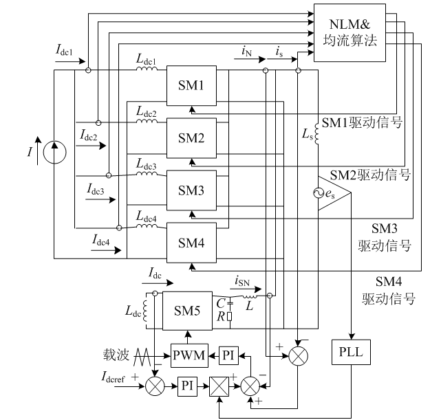 為采用最近電平調制的低頻子模塊,各低頻子模塊的分流電感電流和網側電流經過NLM調制和均流控制確定各子模塊的工作狀態;SM5為采用PWM調制的高頻子模塊,其通過雙閉環的直接電流控制策略確定工作狀態;2部分協調控制,達到降低諧波畸變率和減小開關損耗的效果。