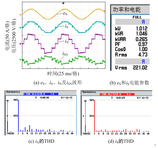 圖15(a)從上至下依次為系統網側電壓eS、NLM單元和PWM單元輸出電流疊加后的網側電流iS、NLM單元輸出電流iN和PWM單元輸出的補償波形iSN。圖15(b)為網側電能參數,功率因數為0.97,基本實現了單位功率因數。圖15(c)為iN的THD,由于實驗只采用2個H橋級聯的NLM單元,其THD較大,達到了16.5%。圖15(d)為iS的THD圖,經過PWM單元的諧波補償作用,不僅使iS實現了正弦化,而且THD降為10.7%,效果顯著。